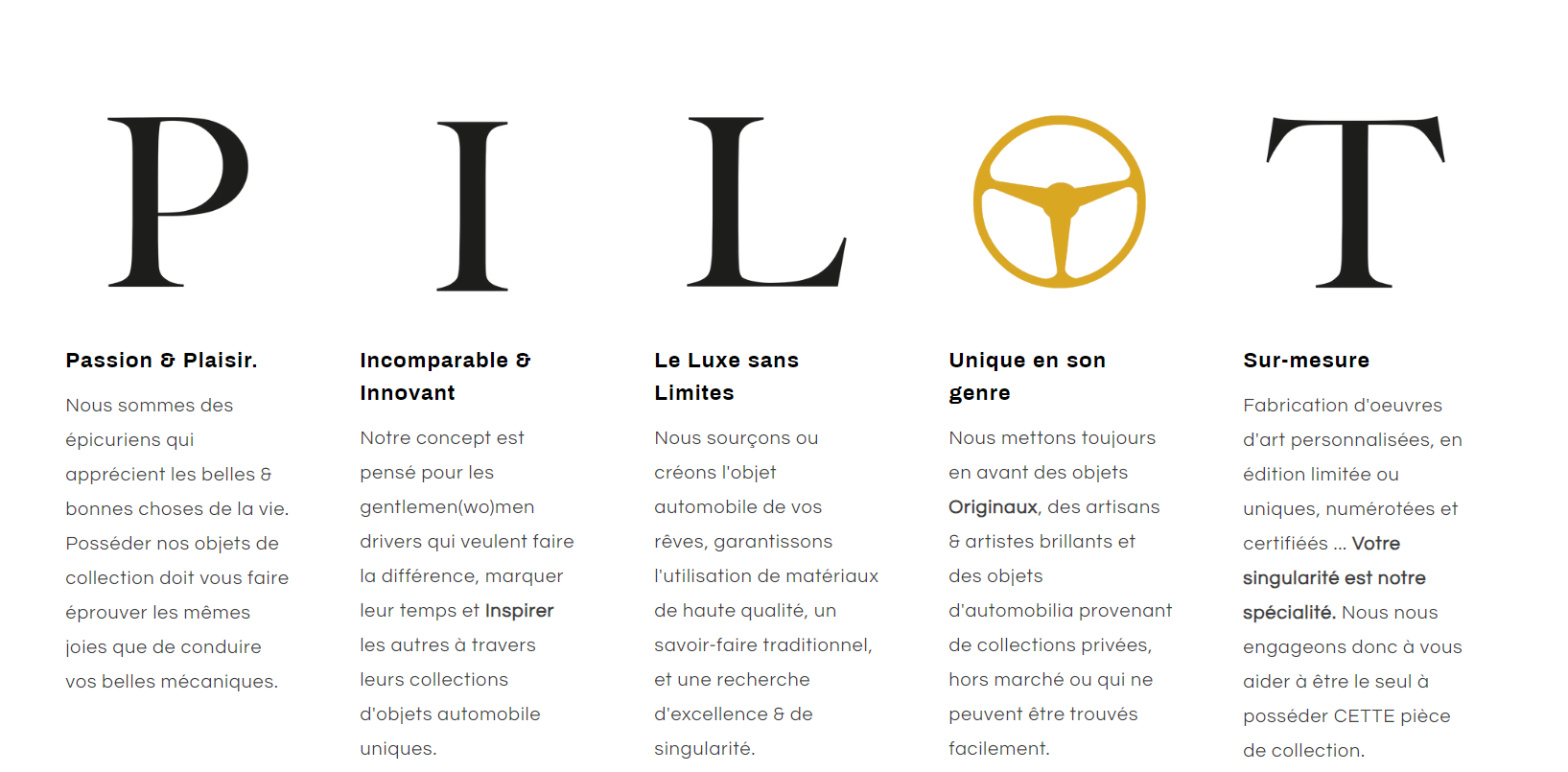 C’est de toutes ces frustrations de passionnée qu’est née l’idée de My Pilot Collection : rassembler en un seul lieu des objets automobiles, rares, artisanaux, artistiques, élégants et originaux. Notre mission est de mettre en lumière ces créateurs talentueux tout en offrant à nos clients exigeants ou leur proche une sélection d’idées cadeaux automobiles d’exception. Des œuvres uniques, en édition limitées, personnalisables ou sur-commande uniquement pour garantir un niveau d’exclusivité encore jamais vu chez les marchands en ligne existants.
