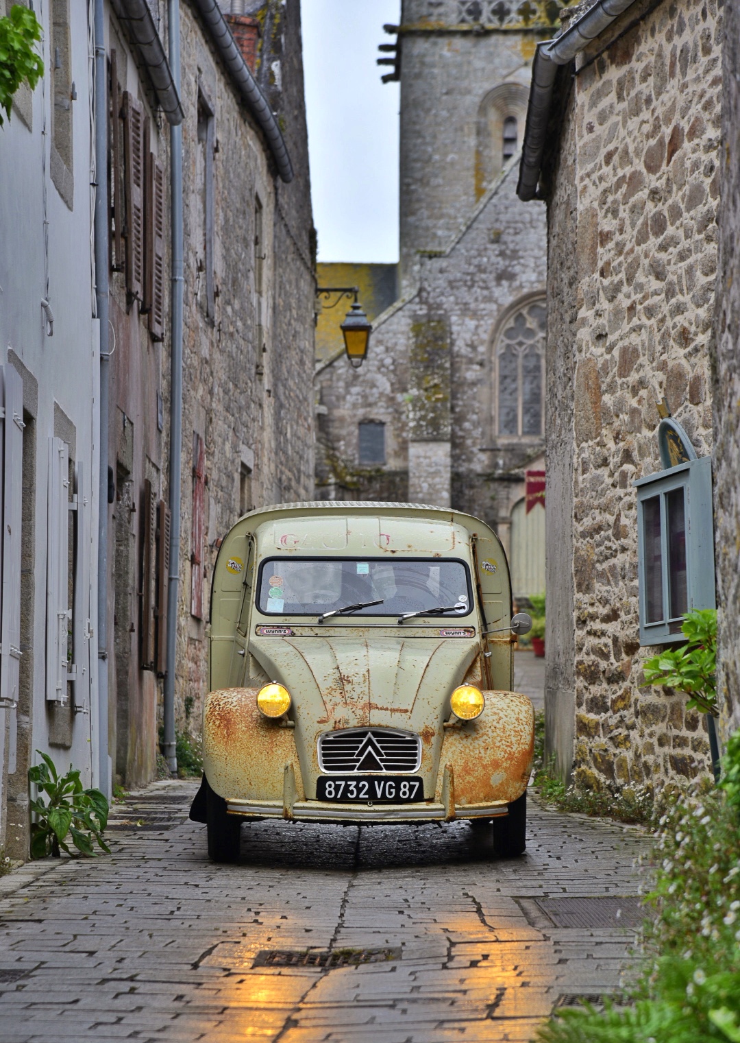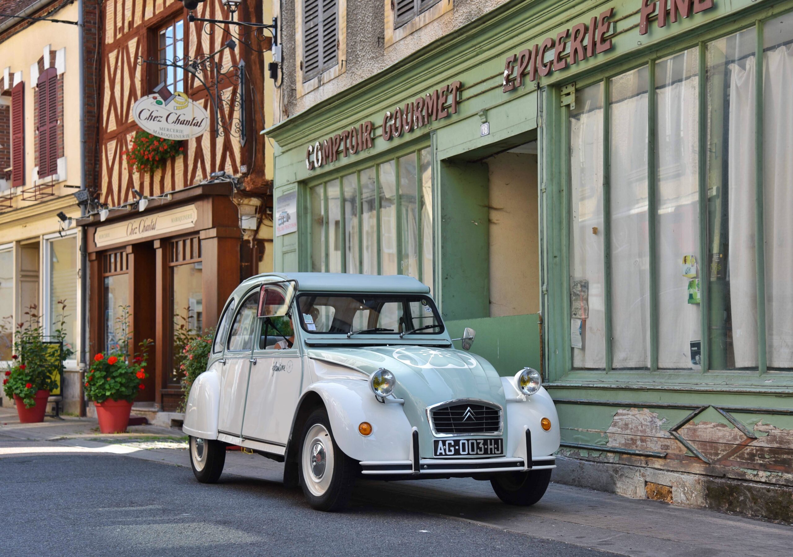 (La photo de ma 2CV Eglantine est celle devant la vieille boutique « le comptoir gourmet, elle est vert jade et blanc)