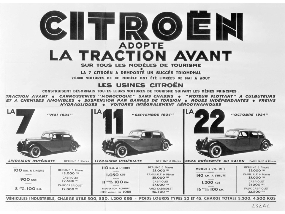 Introduite en 1934, la Traction Avant a rĂ©volutionnĂ© l’industrie automobile avec ses avancĂ©es techniques. Conçue par AndrĂ© Lefèbvre et Flaminio Bertoni, elle est la première voiture de grande sĂ©rie Ă ĂŞtre Ă©quipĂ©e d’une carrosserie monocoque en acier, d’une traction avant, et de suspensions indĂ©pendantes aux quatre roues. Ces innovations lui confèrent une maniabilitĂ© et une stabilitĂ© incomparables pour l’Ă©poque.Â