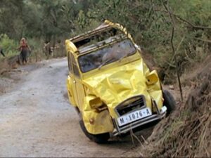 CĂŽtĂ© Français il est difficile de ne pas sourire en repensant Ă la scĂšne hilarante de Bond conduisant une Renault 11 Taxi coupĂ©e đ( en 2) dans « Dangereusement VĂŽtre ». Avec son Ă©lĂ©gance habituelle, il se fondrait presque dans la circulation parisienne ! Et notre 2CV Nationale compĂštement cabossĂ©e et qui s’envoie en l’air đ€ pour  » For your eyes only « …