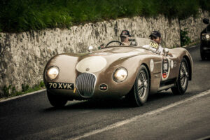 1953 freine fort, la Jaguar Type C signe l’arrivée du frein à disque repris de l’aviation. Les freins à disque permettaient aux avions de se poser sur un porte-avion ! Citroën reprendra l’idée sur la DS et initie la démocratisation du freinage à disque sur les véhicules de route.