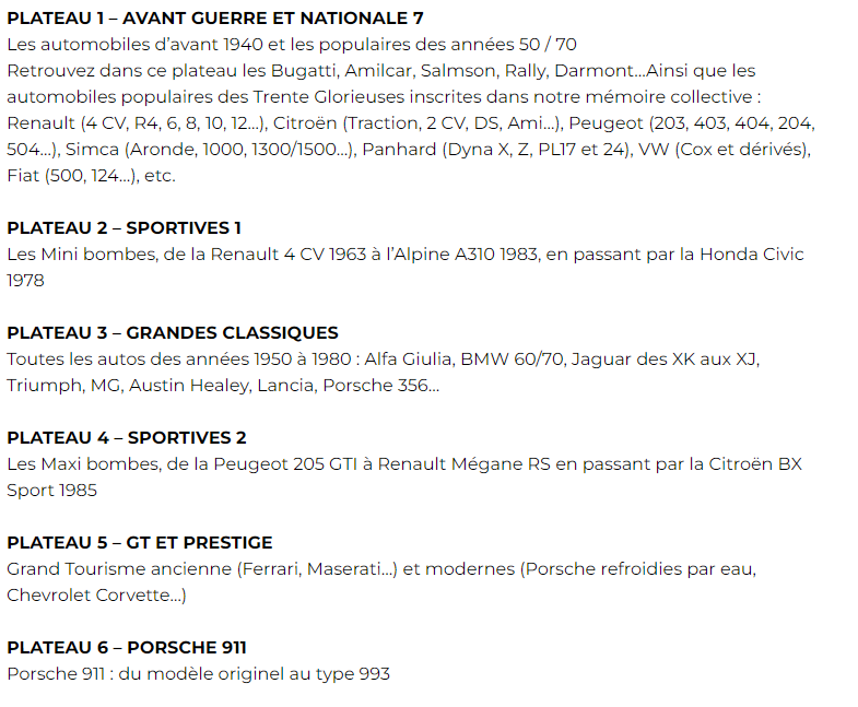 Au programme, six plateaux dédiés aux voitures emblématiques :